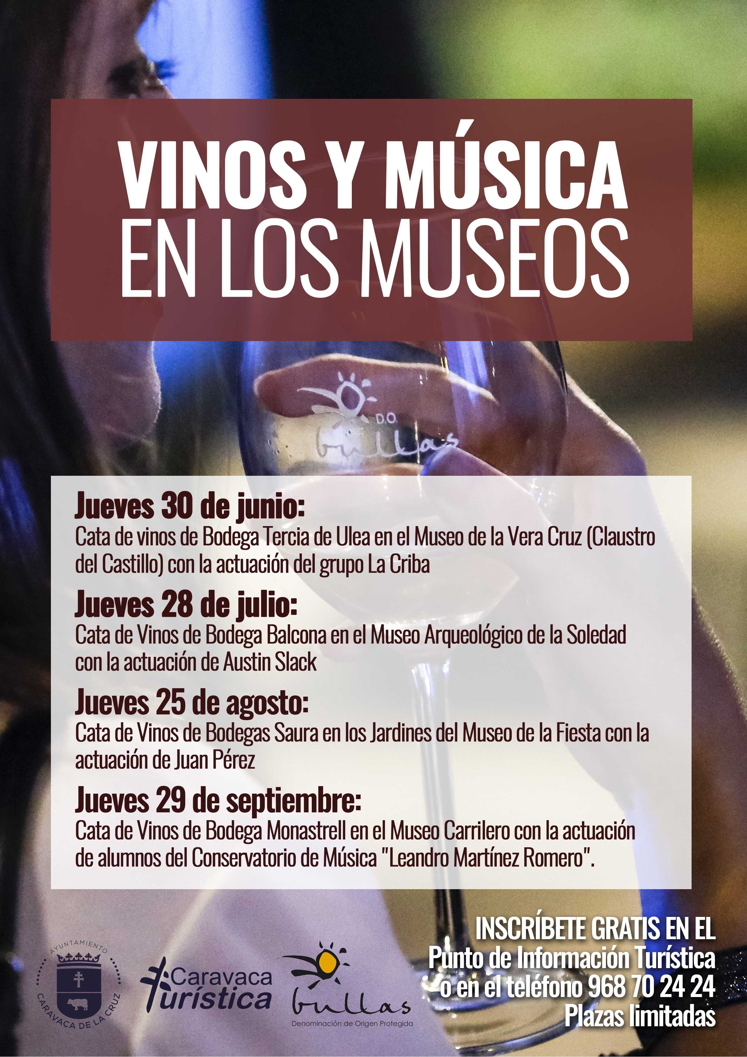 Las catas se celebrarán acompañadas de música en directo y estarán limitadas a 40 plazas por orden de inscripción. La programación dará comienzo el jueves 30 de junio en el Museo de la Vera Cruz (Claustro del Castillo) de la mano de Bodega ‘Tercia de Ulea’ y el grupo musical ‘La Criba’. El 28 de julio la cata se realizará en los exteriores del Museo Arqueológico ‘La Soledad’ con los caldos de la Bodega Balcona y la música del artista local Austin Slack. El 25 de agosto el entorno elegido son los jardines del Museo de la Fiesta con la actuación de Juan Pérez y la bodega Saura. El ciclo ‘Música y Vinos’ se clausurará el 29 de septiembre en el Museo José Carrilero con la bodega Monastrell y la big band del Conservatorio ‘Leandro Martínez Romero’ de Caravaca de la Cruz.