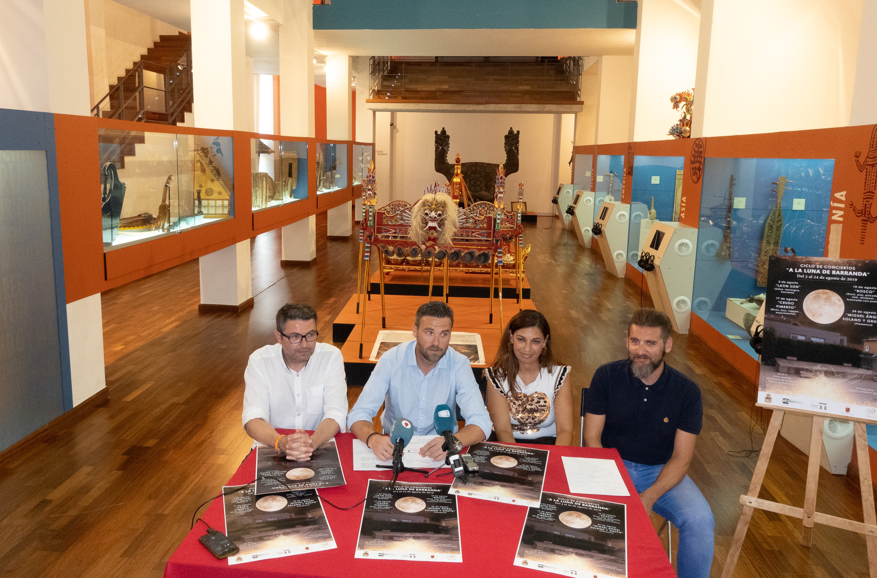 23/07/18. El ciclo ‘A la luna de Barranda’ trae conciertos de acceso gratuito al Museo de la Música Étnica-Colección Blanco Fadol, organizados por el Ayuntamiento de Caravaca de la Cruz. El flamenco, el jazz, el reggae, el folk, el pop o la música experimental son algunos de los géneros o estilos que se escucharán los cuatro primeros sábados de agosto, tal y como se anunció en la presentación de este ciclo, que contó con la participación del alcalde de Caravaca de la Cruz, José Francisco García, junto a los concejales de Cultura y Pedanías, Juan Manuel de León y José Antonio Sánchez, respectivamente, y una de las responsables del Museo de la Música, Elena Rivero.