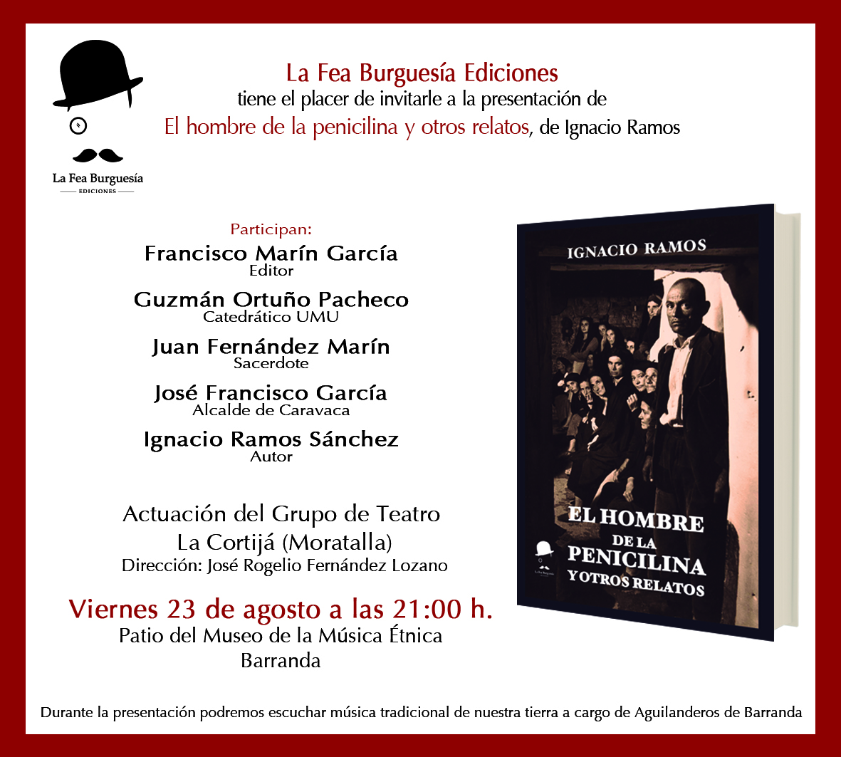 Acompañarán al autor el catedrático de la Universidad de Murcia Guzmán Ortuño Pacheco, el sacerdote Juan Fernández Marín, el editor de ‘La Fea Burguesía’ Francisco Marín y el alcalde de Caravaca de la Cruz, José Francisco García. Actuará además el grupo de teatro ‘La Cortijá’, de Moratalla, dirigido por José Rogelio Fernández, y sonará la música de la tierra con los Aguilanderos de Barranda.