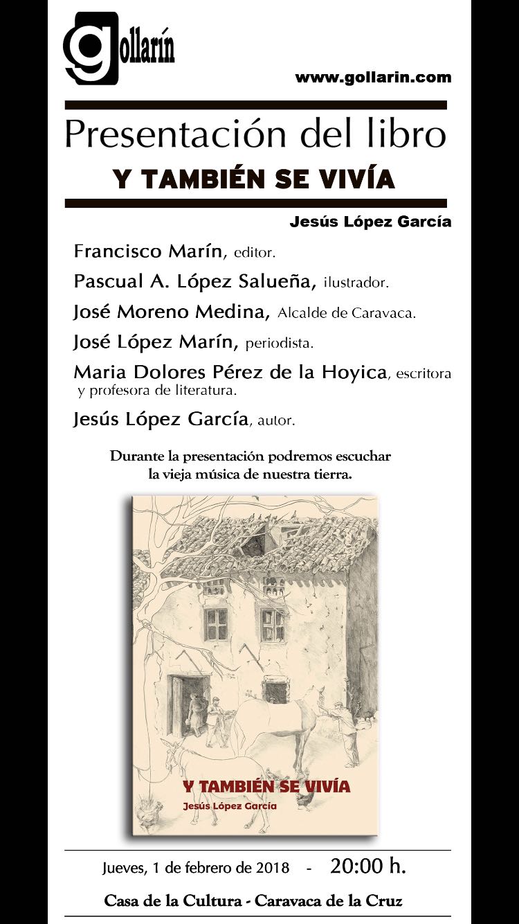 La Casa de la Cultura ‘Emilio Sáez’ acoge mañana, jueves 1 de febrero, a las 20.00 horas, la presentación en Caravaca de la Cruz del libro ‘Y también se vivía’, escrito por el caravaqueño Jesús López García y publicado por la editorial Gollarín.