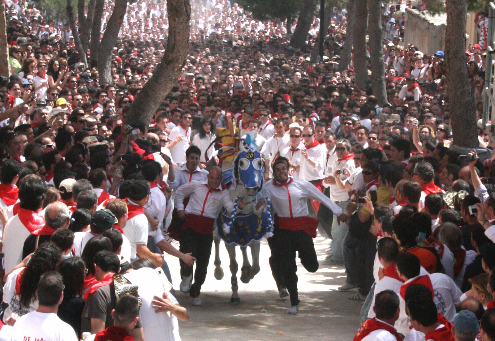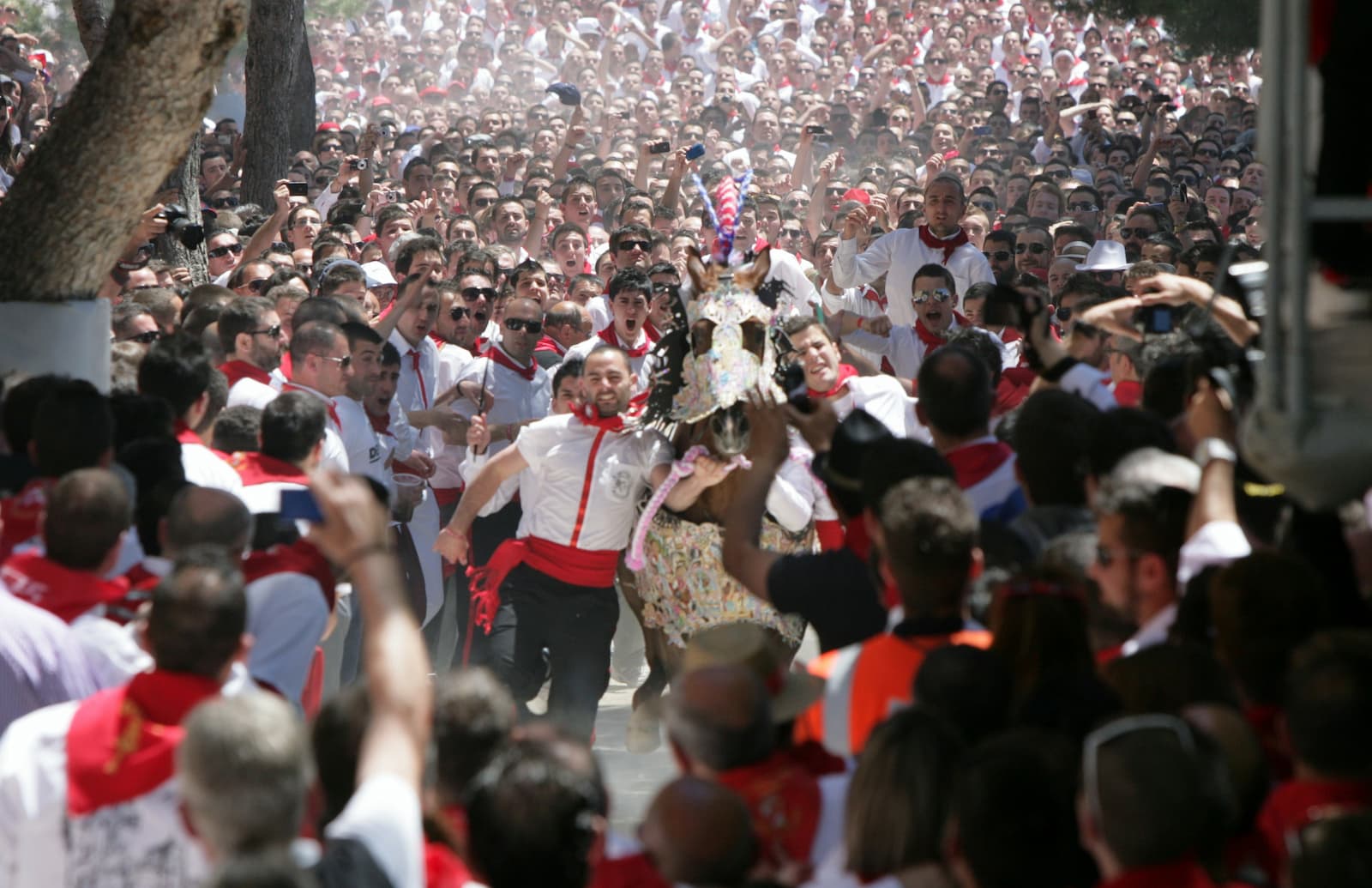 Hay expectación y tensión de espera para ver aparecer a los caballos que van subiendo al principio de la cuesta. La gente apenas deja espacio libre; hay que abrirse paso entre ella, y, en medio de este ambiente, una bandeja de flores que avanza y se pierde entre el gentío. Es un destello humilde de lírica en medio de la épica.