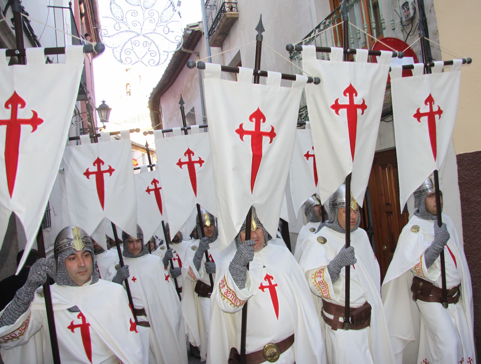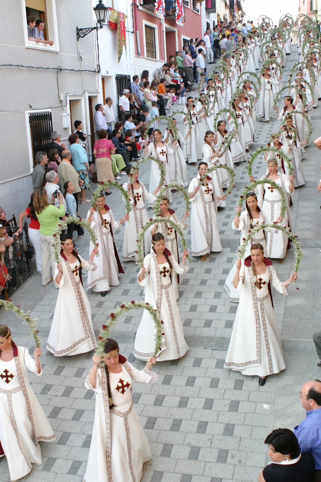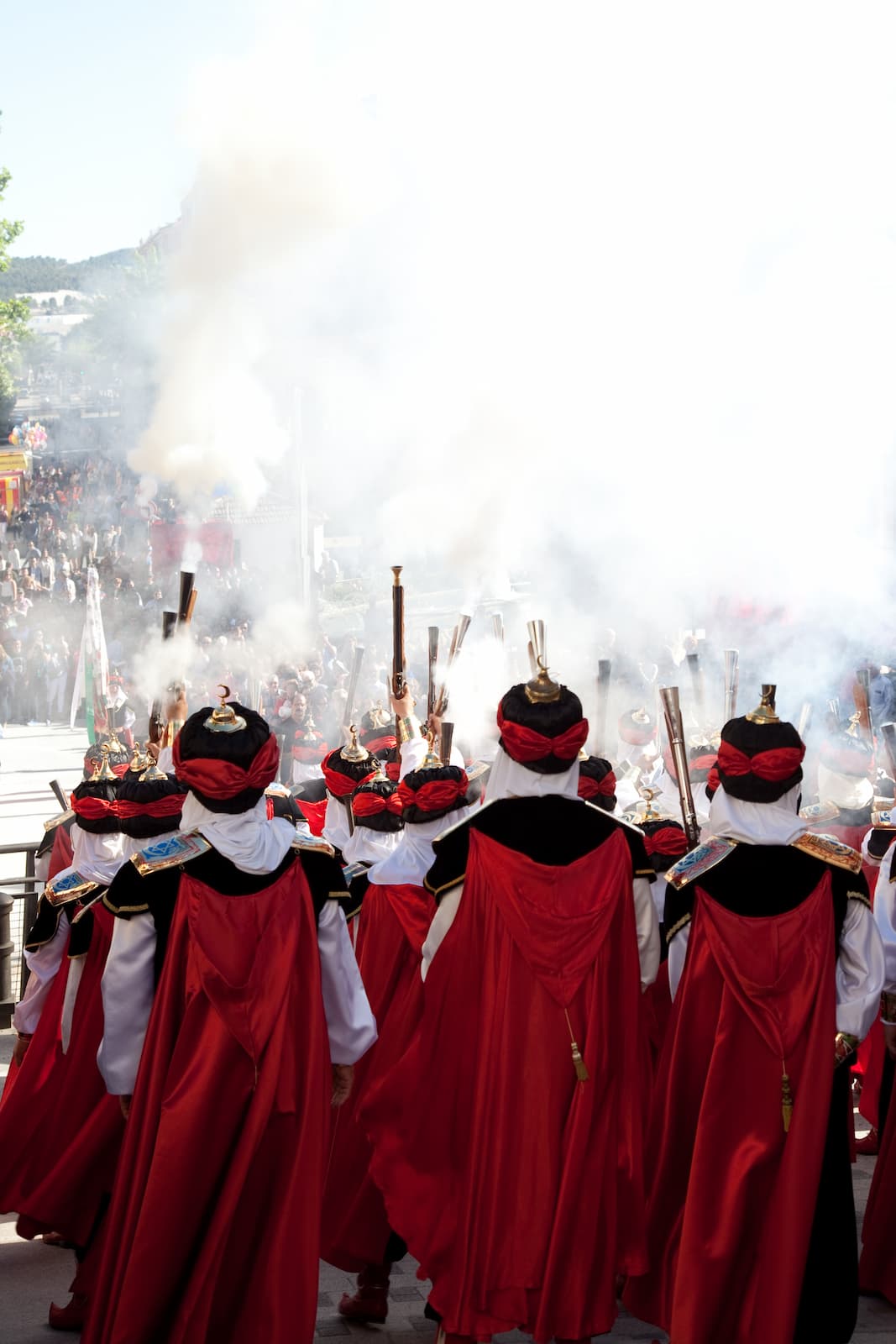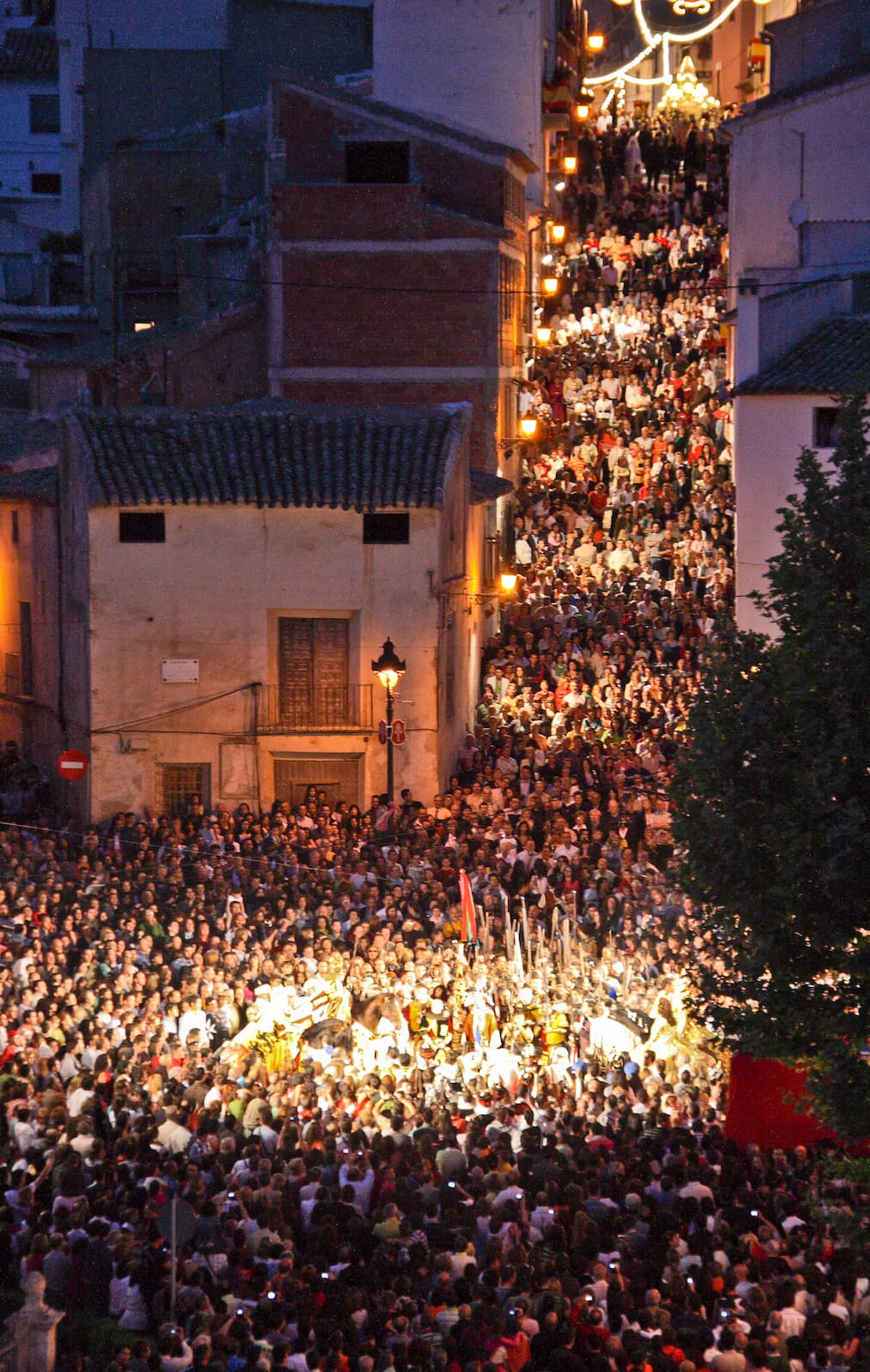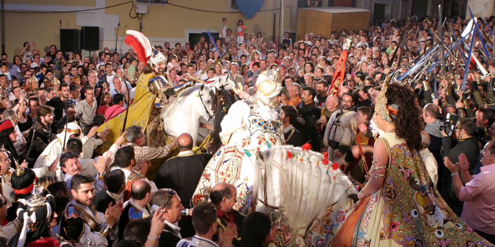 Bajan los grupos compactos con paso uniforme, bandeándose por la pendiente con música a veces trepidante, con aires de un ejército que va a la batalla y ya cercano al escenario para tomar posiciones. Al fondo la plaza, repleta de gente, deja espacio para que los grupos vayan ocupando sus lugares. Los reyes, a caballo en medio de la plaza, se disponen a parlamentar.