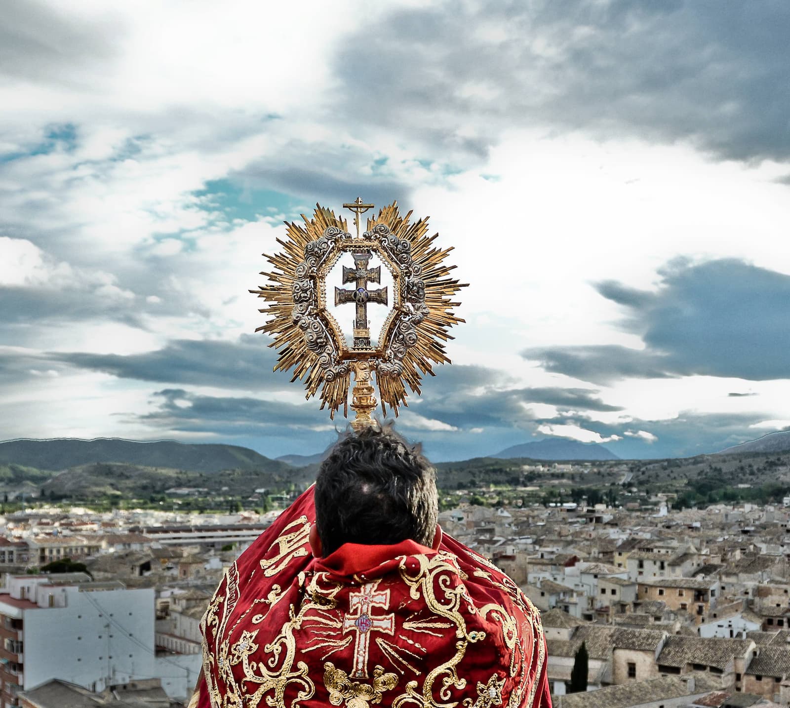 Ya con las últimas luces y con las sombras de los montes lanzadas hacia la ciudad, con el tenue aliento rojizo de las alturas de la serranía, la Cruz se pone en contacto último con la naturaleza. Desde las almenas y hacia los cuatro puntos cardinales da la bendición a la ciudad, a los campos, a las cosechas en un abrazo de fusión y protección.