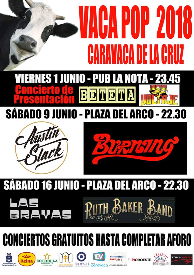 El comienzo del ‘Vaca Pop’ 2018 lo marcará el concierto-presentación, programado en el pub ‘La Nota’, para el viernes 1 de junio, a las 23.45 horas, con las actuaciones del nuevo grupo caravaqueño encabezado por el cantante y músico ‘Beteta’ y de ‘Doctor Voltaje’, banda valenciana de rock and roll integrada por cinco experimentados músicos del circuito underground español.
