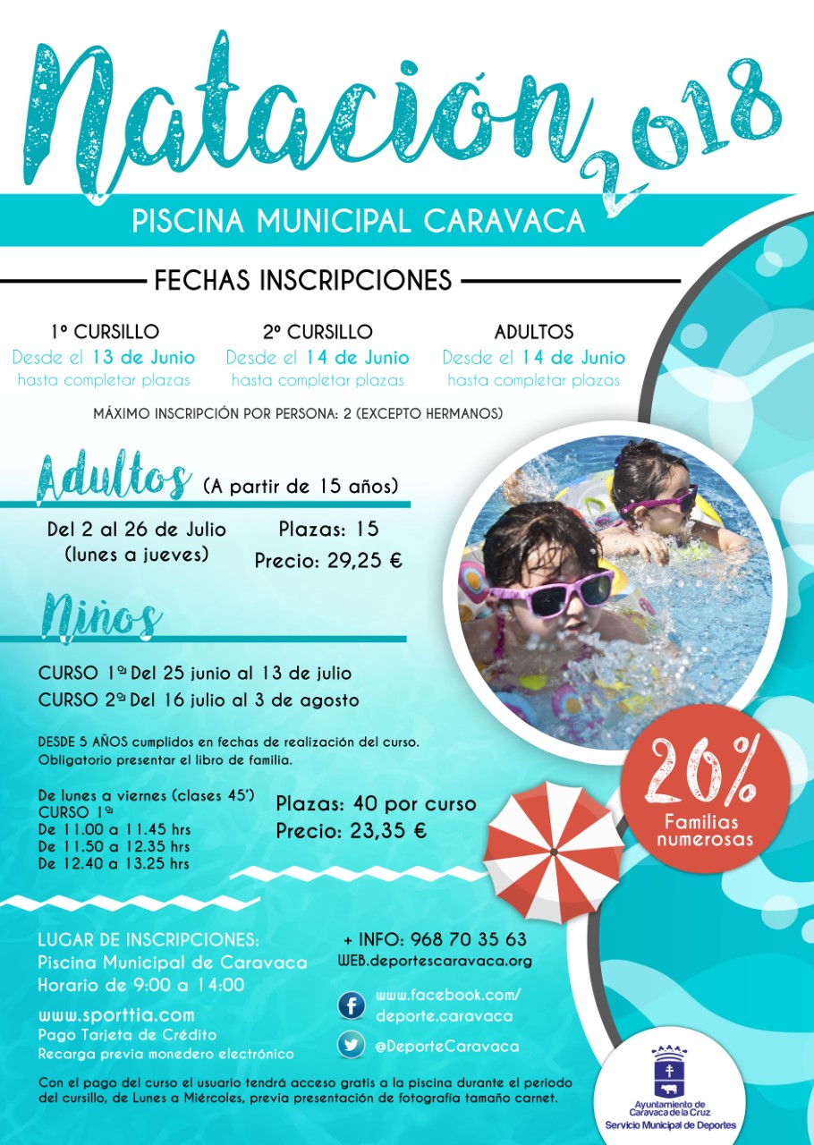 Las inscripciones se realizarán en la piscina municipal, de 9.00 a 14.00 horas, o a través de la web www.sporttia.com, con un máximo de dos matrículas por persona (excepto hermanos). Aquellas personas interesadas en recibir más información pueden contactar con la Concejalía de Deportes, a través del número de teléfono 968 70 35 63 o visitando la web www.deportescaravaca.org.