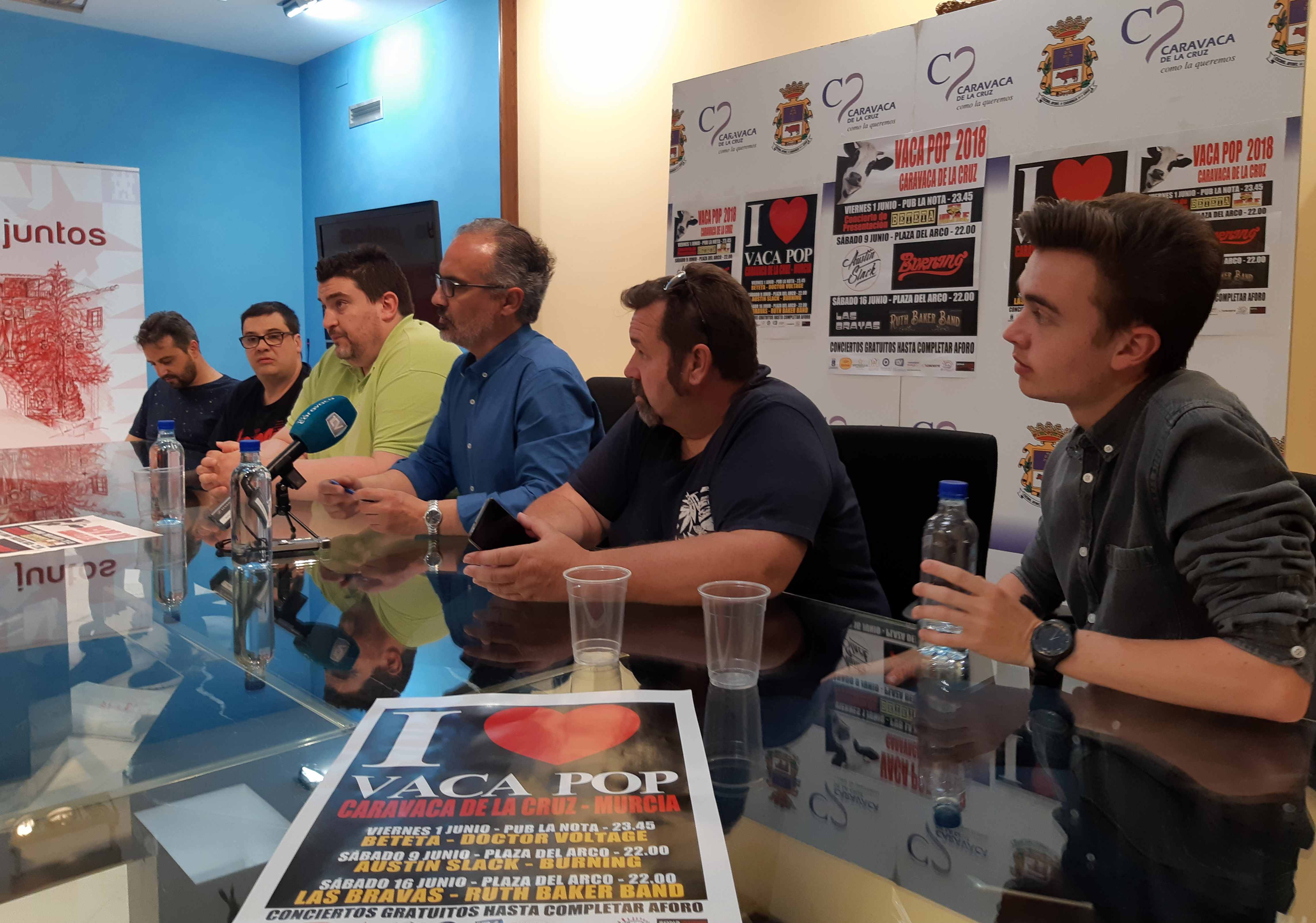 28/05/18. La edición 2018 del festival caravaqueño ‘Vaca Pop’ se celebra del 1 al 16 de junio con tres conciertos de acceso gratuito, que fueron presentados por el alcalde de Caravaca del la Cruz, José Moreno, y el concejal de Cultura en el Ayuntamiento de Caravaca de la Cruz, Óscar Martínez, junto a los componentes de la asociación ‘Vaca Pop’, Bryn Slack, Mateo Marti y Antonio Fructuoso.
