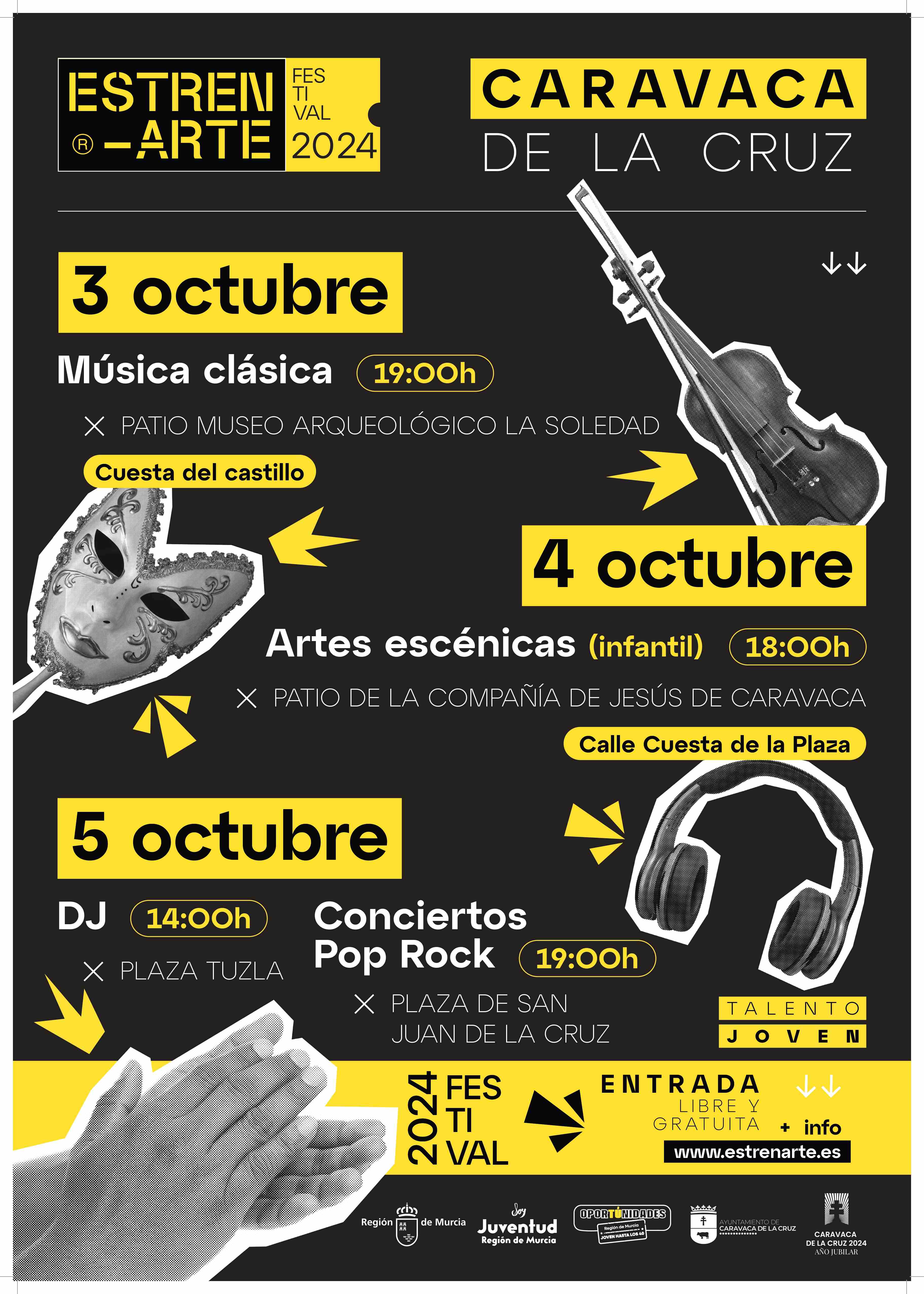 16/09/2024. Caravaca de la Cruz será durante los días 3, 4 y 5 de octubre la sede del Festival de Arte Joven de la Región de Murcia ‘Estrenarte’. Distintos espacios urbanos acogerán exhibiciones de música y artes escénicas a cargo de los creadores los proyectos seleccionados en esta edición.