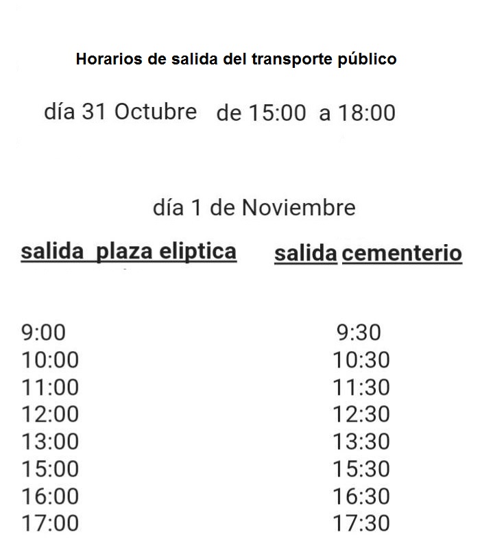 Hoy, martes 31 de octubre, el autobús realizará salidas desde la plaza Paco Pim hasta las instalaciones del Cementerio, de las 15.00 a las 18.00 horas. Mañana, miércoles 1 noviembre, el servicio de prestará en horario de mañana y tarde, de las 9.00 a las 13.30 horas y de 15.00 a 17.30 horas.