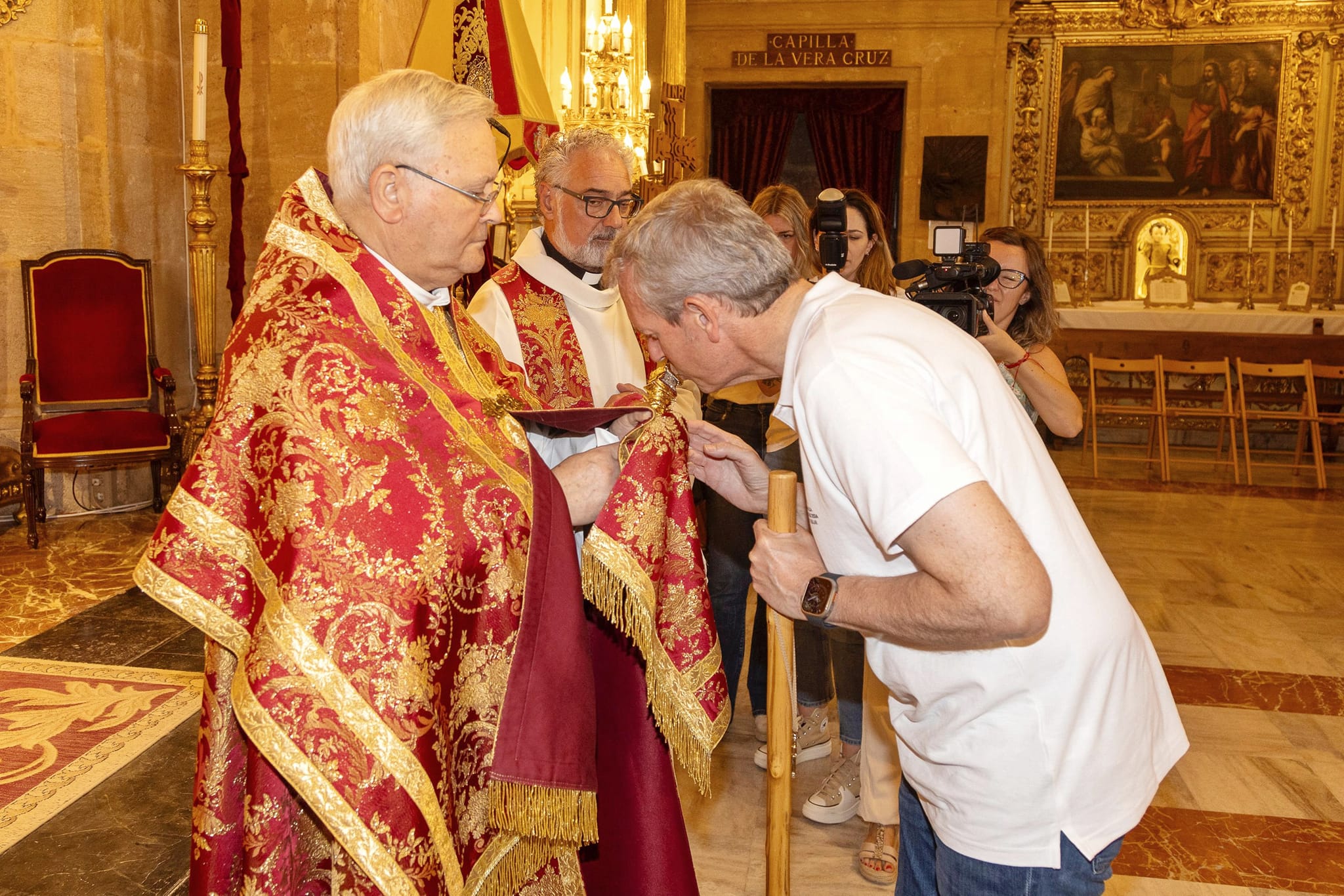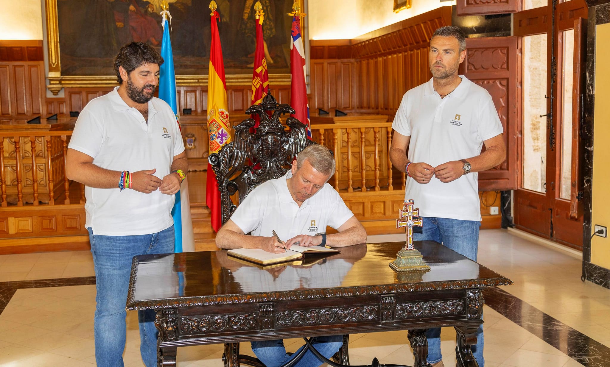El presidente de la Xunta ha firmado también en el libro de honor del Excmo. Ayuntamiento de Caravaca de la Cruz y ha subido a la basílica en donde ha podido adorar la Stma. y Vera Cruz de Caravaca ofrecida por el obispo de la diócesis de Cartagena Mons. D. José Manuel Lorca Planes.