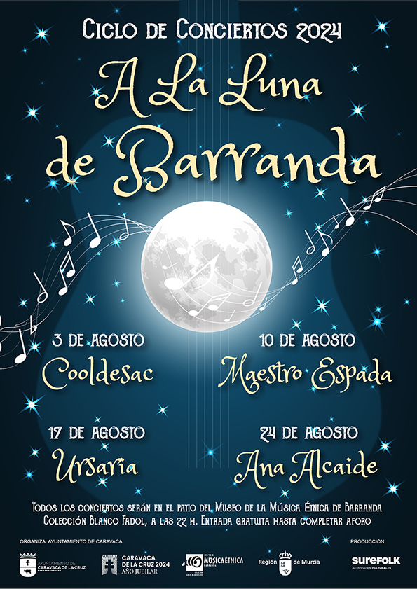02/08/2024. El ciclo de conciertos ‘A la luna de Barranda’, que se celebra en el Museo de la Música Étnica-Colección Blanco Fadol, organizado las concejalías de Cultura y Turismo del Ayuntamiento de Caravaca de la Cruz, comienza este sábado, 3 de agosto, a las 22.00 horas, con la música celta de la banda alicantina ‘Cooldesac’.