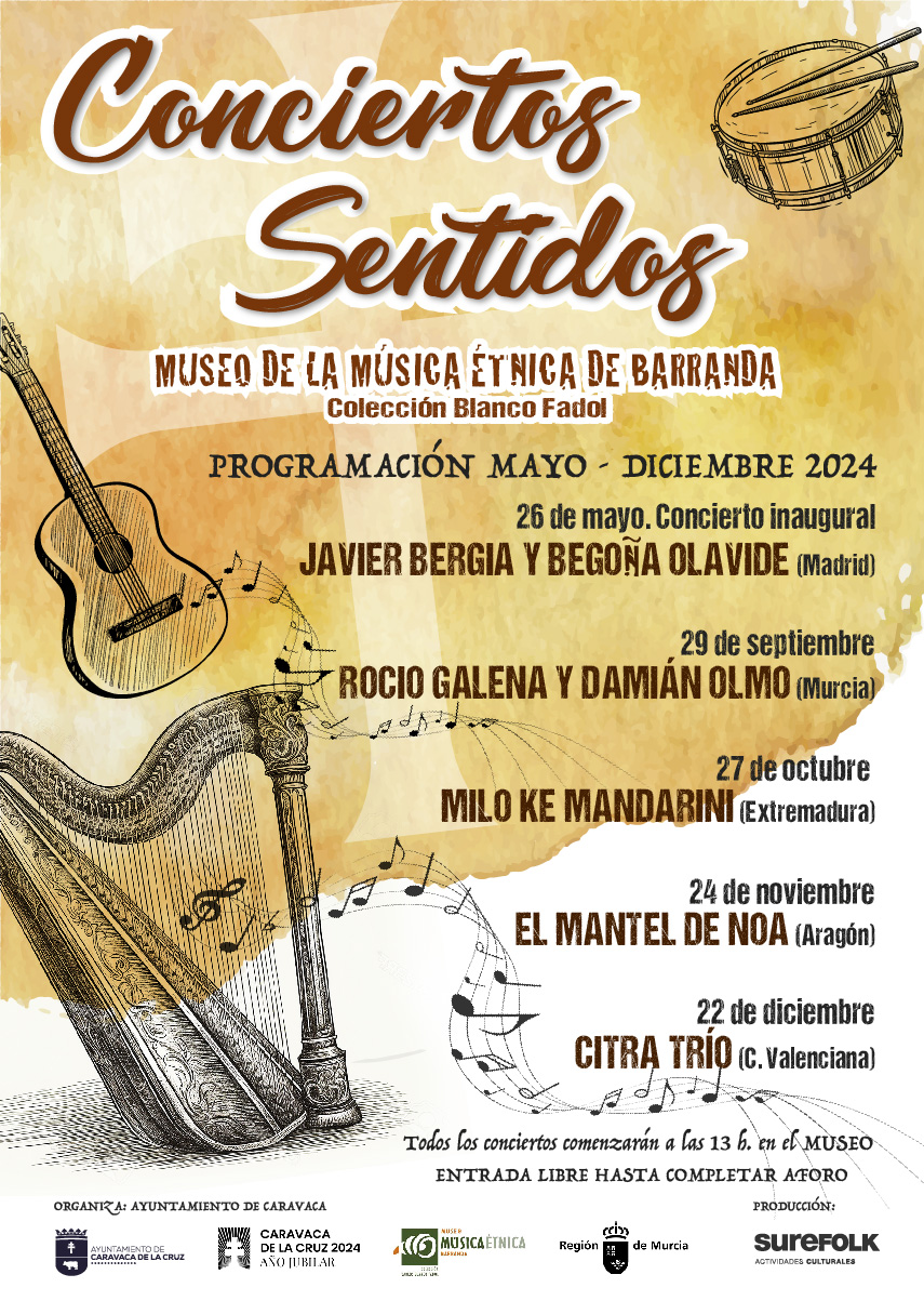 15/05/2024. Tras cerca de quince años sin celebrarse, el Ayuntamiento de Caravaca de la Cruz recupera el ciclo ‘Conciertos Sentidos’ del Museo de la Música Étnica de Barranda-Colección Blanco Fadol. Una propuesta cultural que tendrá lugar coincidiendo con últimos domingos de mes, ofreciendo una variada representación de músicas del mundo.